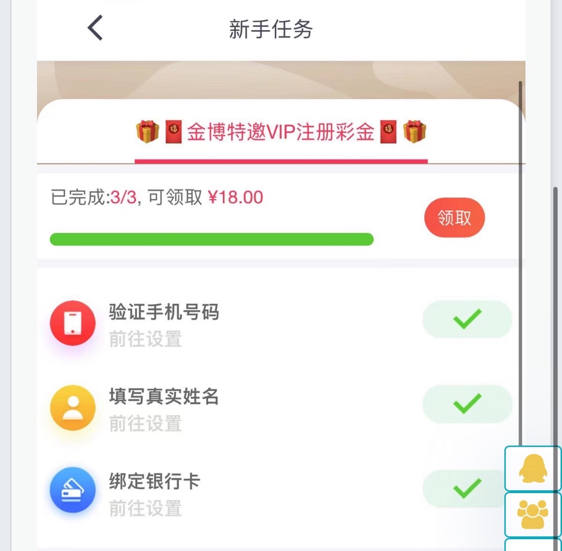 活动:注册绑定个人消息右下角有个新人福利点进去领取18—88彩金大部分人都有