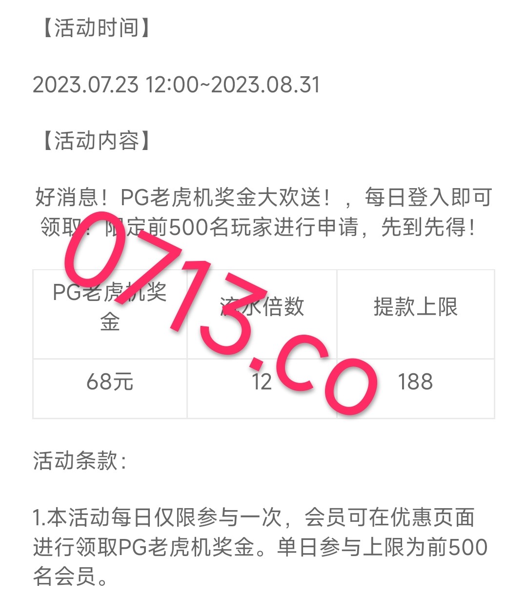 以前发过这个项目的送18 新老用户注册登陆 点击优惠-全部优惠的第二个PG大放送 自助领取68元彩金 68元彩金每天限制500个名额 没名额了就凌晨12点准时去领取