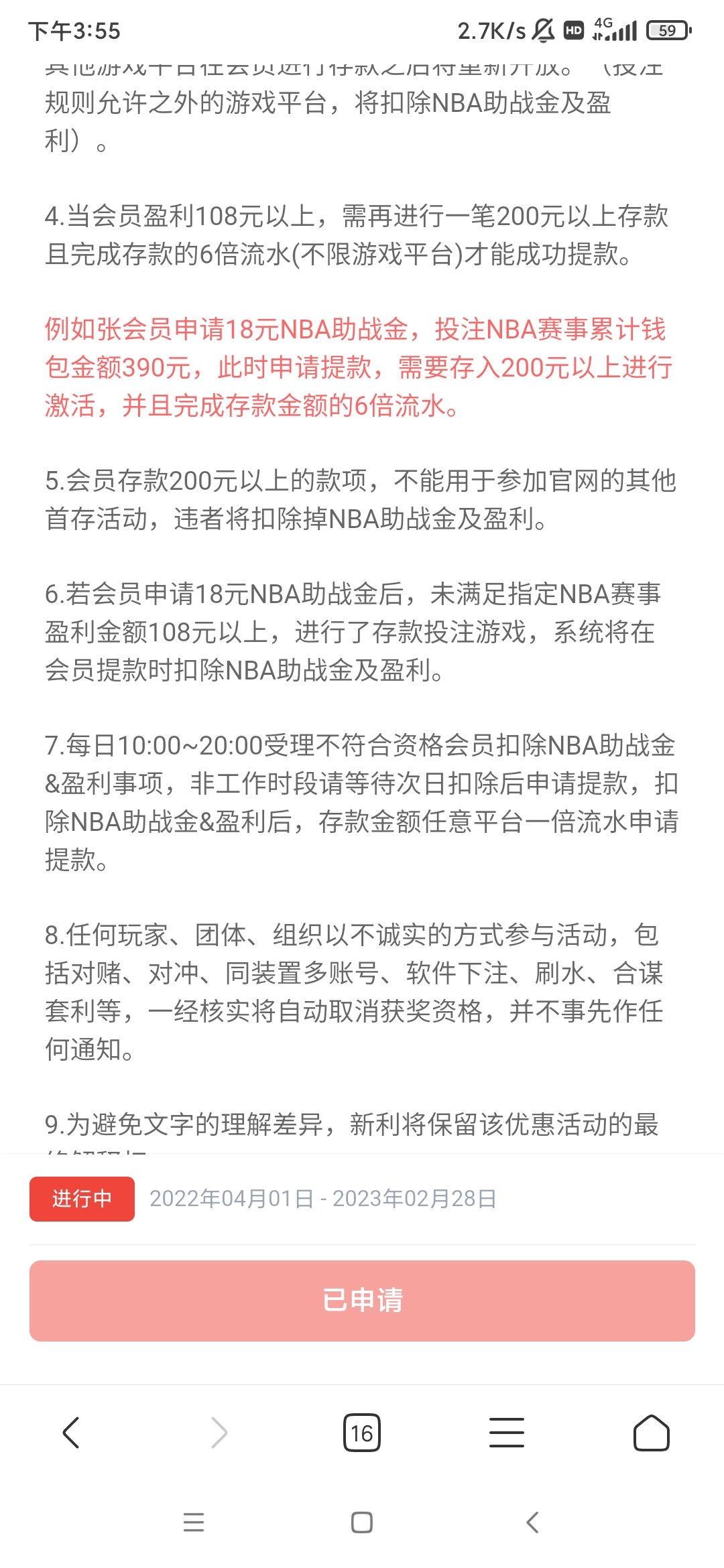 2022.12.18前注册的老用户自助申请18彩金,只能投注NBA赛事,满100提