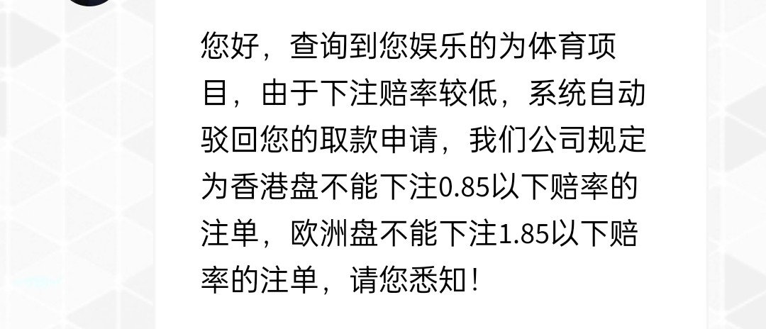 不推荐去417玩,体育低于1.85都不给下注,简直有毒。明摆着逼着人输。开平台人来人往,各有各的玩法,既然开了盘子,客人买什么肯定是根据自己的想法来的,没见到这种逼着人强行下高赔的。
