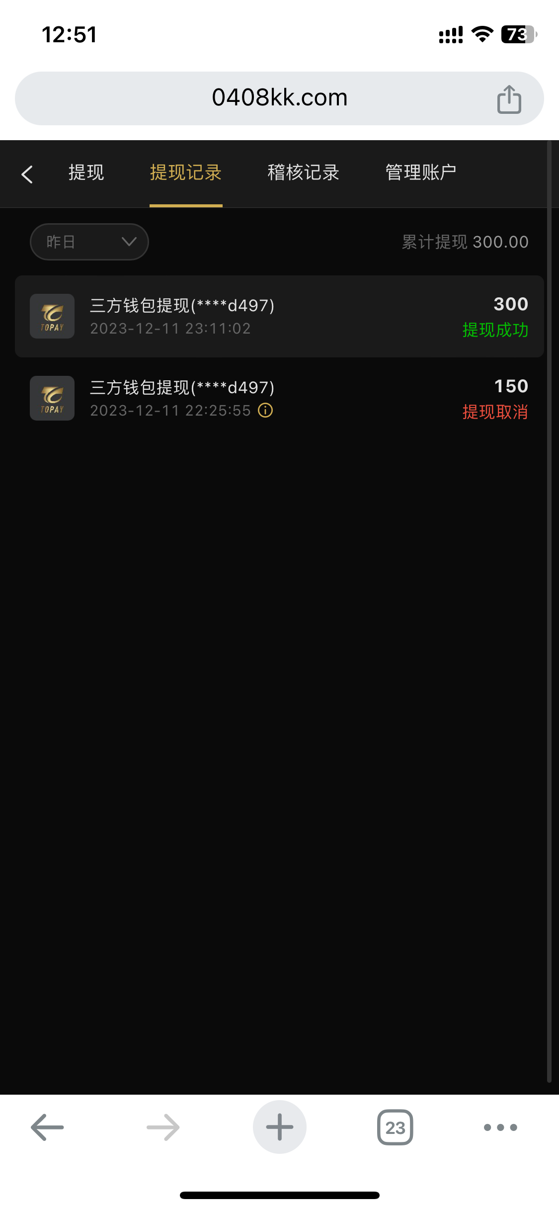 鲁死够状冲 ▶ zjh330086 你的到账没有,我也是提300,还没到账 2023-12-11