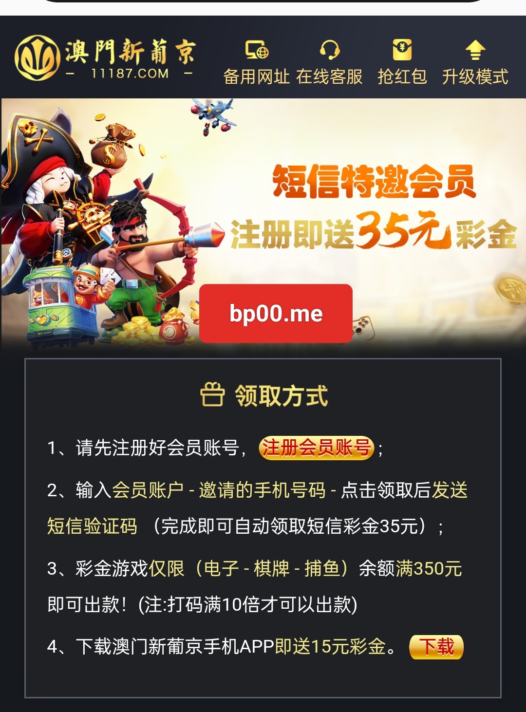 新用户注册绑卡 再返回网站申请35元彩金 特邀碰瓷 都去试试 限制游玩电子捕鱼棋牌 10倍流水 最低提款350元