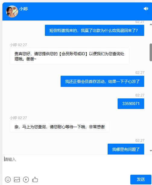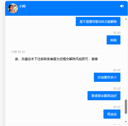 短信特邀我来的,送了10块钱,打到115出款退回来了,客服说IP异常需要再充值一笔100,。下来我玩AG射龙门梭哈了一下,又玩AG电子,一下余额变588了,又问客服,客服又说充100就能解除,敢不敢信?