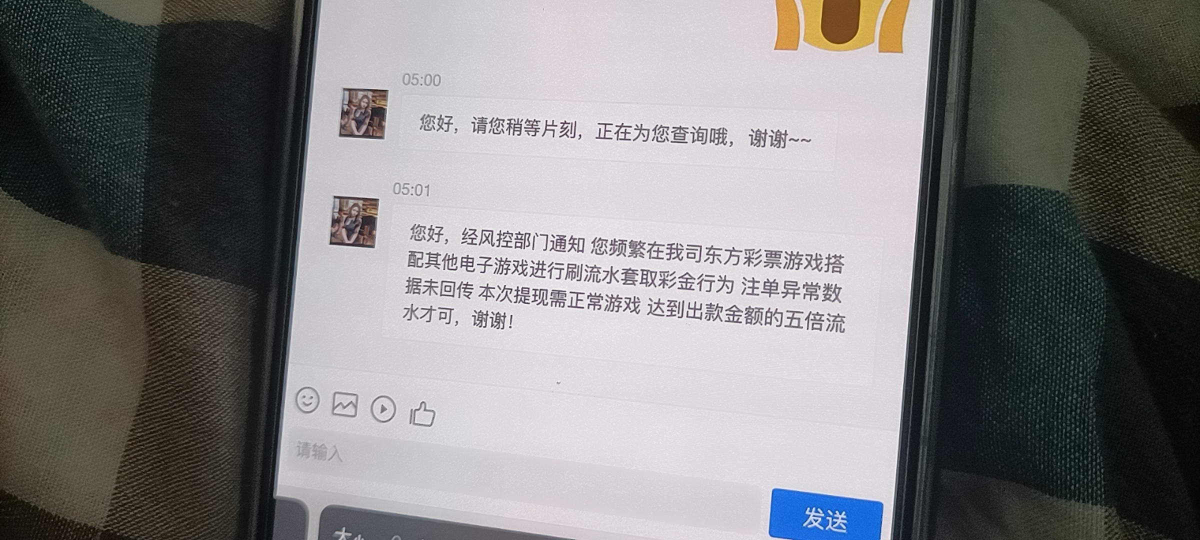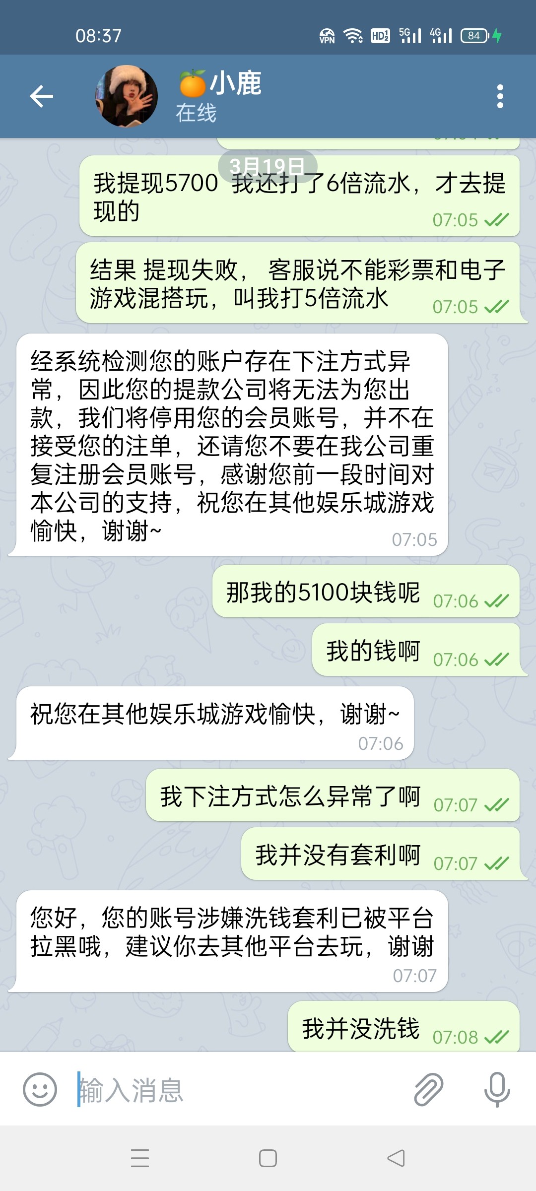 事情是这样的,我今天上了4000   然后打快三 打到5600   然后玩财神打鱼 打了2万的水(因为要3杯流水提现) 然后提现,第一次提现失败,提示联系客服,  我找客服了  客服理由是我不能同时玩快三和pg电子游戏,然后让我重新玩出款的5倍流水,我只玩一个游戏 一飞冲天, 等我打完5倍流水  38000多流水 满足了,我问客服 可以提现吗? 客服说可以,但我提现之后 2分钟不到就给我封号了,钱也被扣除了,然后找客服 无限被拉黑 一句话也不理你,直接拉黑聊天窗口 封ip!
