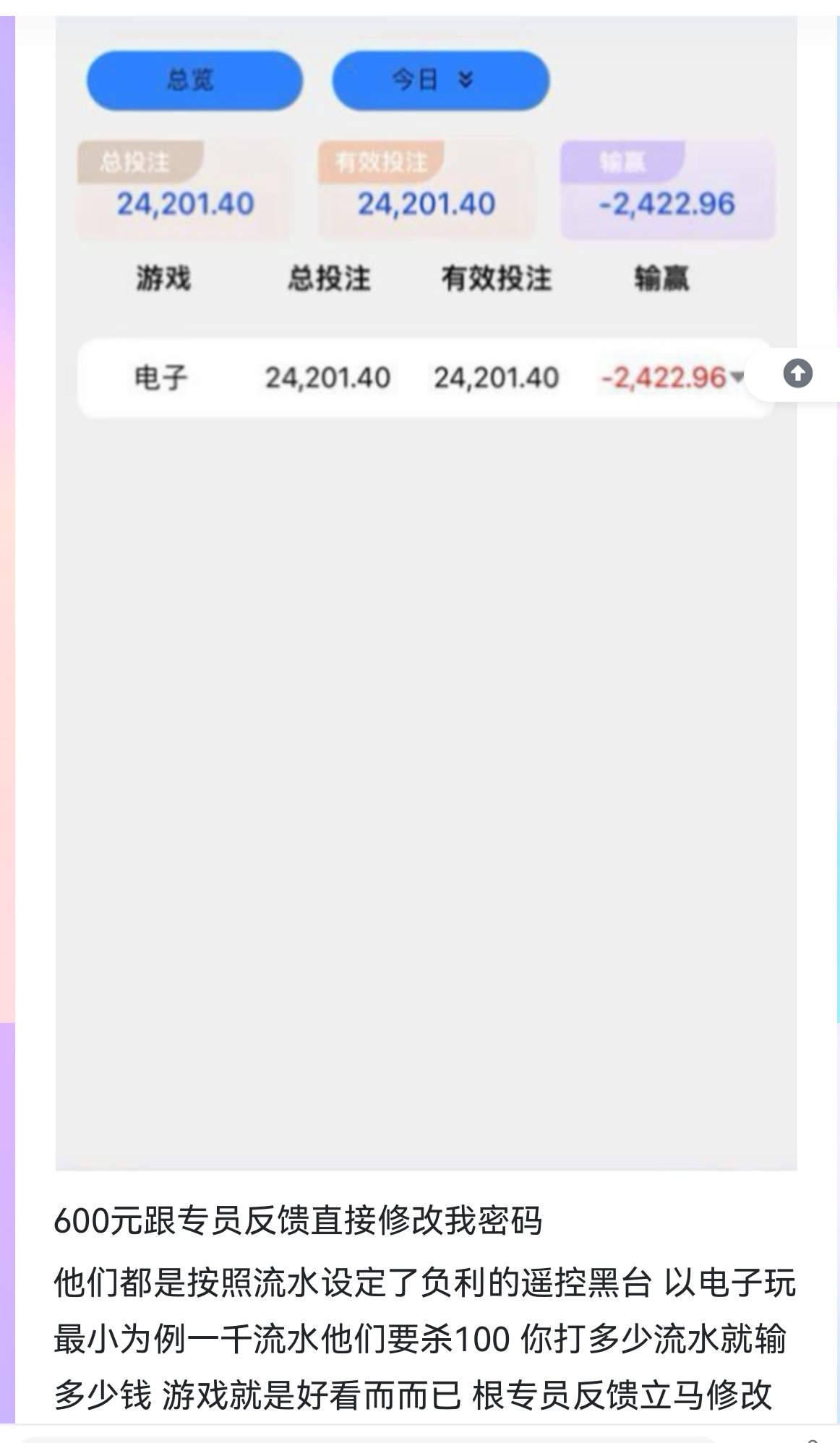 又搞高额优惠活动黑钱了大家注意他们台电子都是私人的 按照比例设定了负利的 以最小的摇麻将 他们按照1千流水杀100 200设定好了杀超了就有回来 比如1千流水你8毛摇一千流水输了400元玩下去肯定会回来300 因为设定了你一千只杀100 赢时也是一样的 你爆多大一千流水你赢了几百元不走百分百玩下去会输到他设定的这个比例 开始时就设定了 没运气说的遥控台