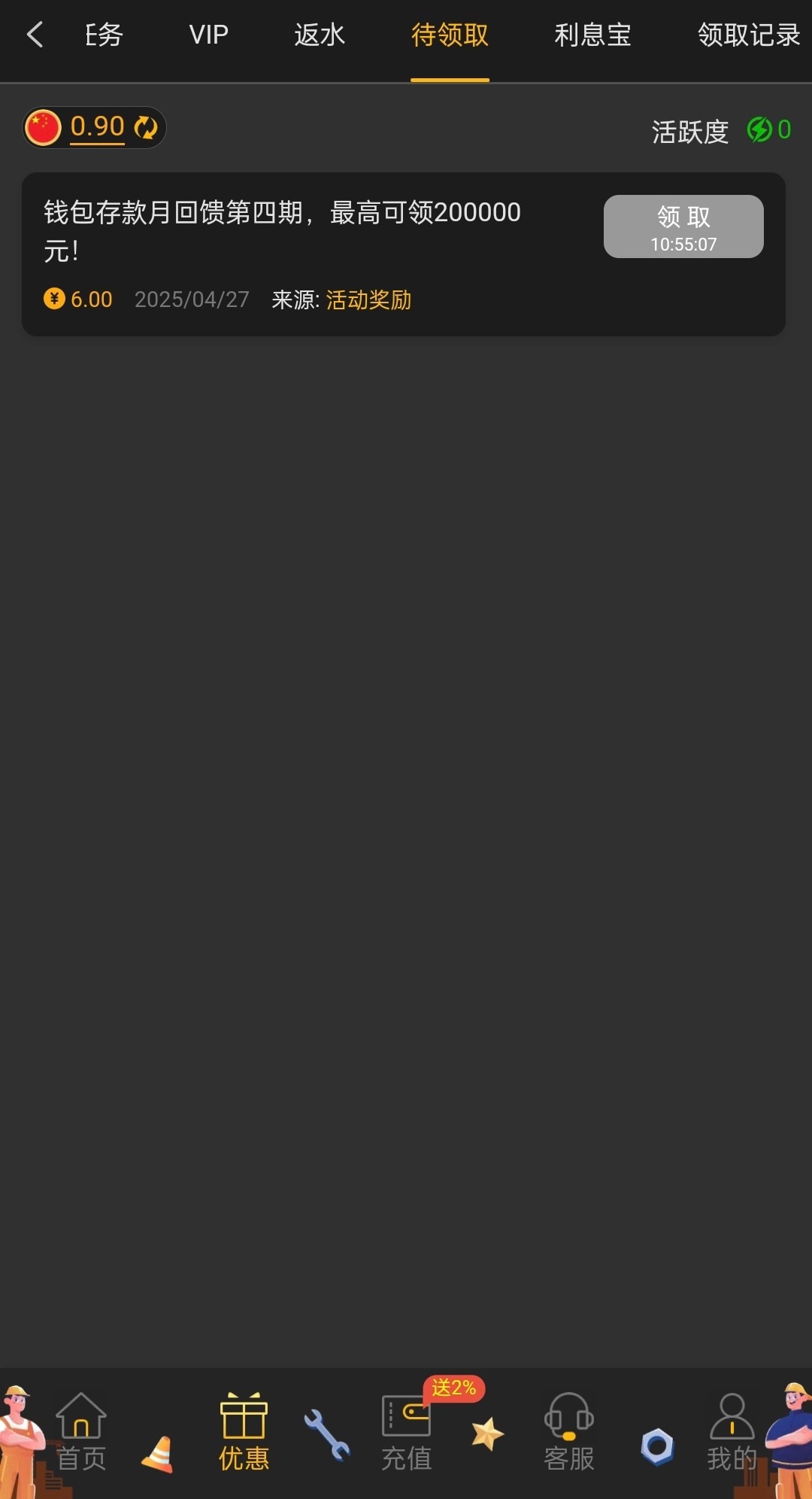有过钱能充值过的兄弟可以上号看看优惠有没有,彩金好像要隔天才能领取
