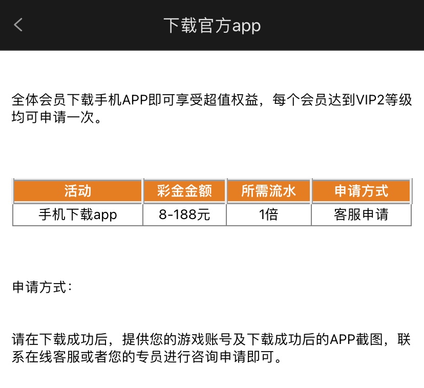 需要VIP2以上的用户才有下载APP彩金,符合的兄弟可以下载登入上联系客服申请,彩金一倍流水