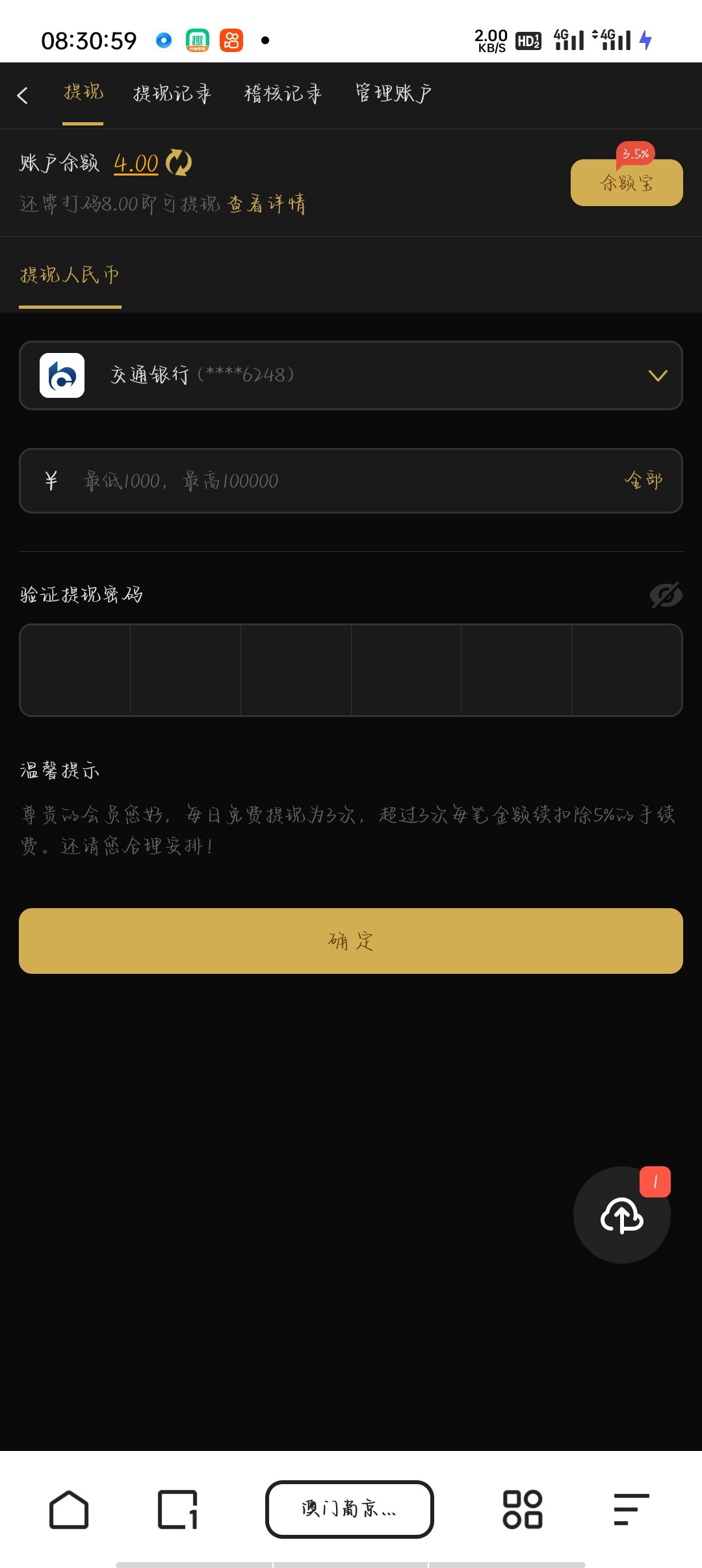 送六块钱提现,最低1000 真不拿哥们当外人赌神都没这么吊